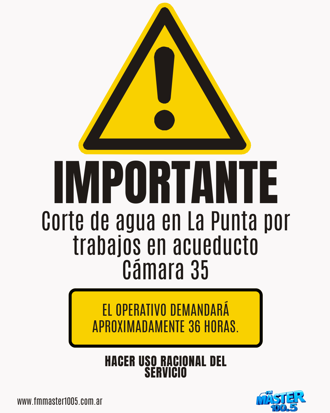 La ciudad de La Punta se verá afectada por un corte de agua cruda debido a trabajos en el acueducto Cámara 35, que comenzarán en la madrugada del martes 7 de octubre. El operativo demandará aproximadamente 36 horas, afectando también a Los Puquios y a la planta potabilizadora ‘Vientos del Portezuelo’ de San Luis.