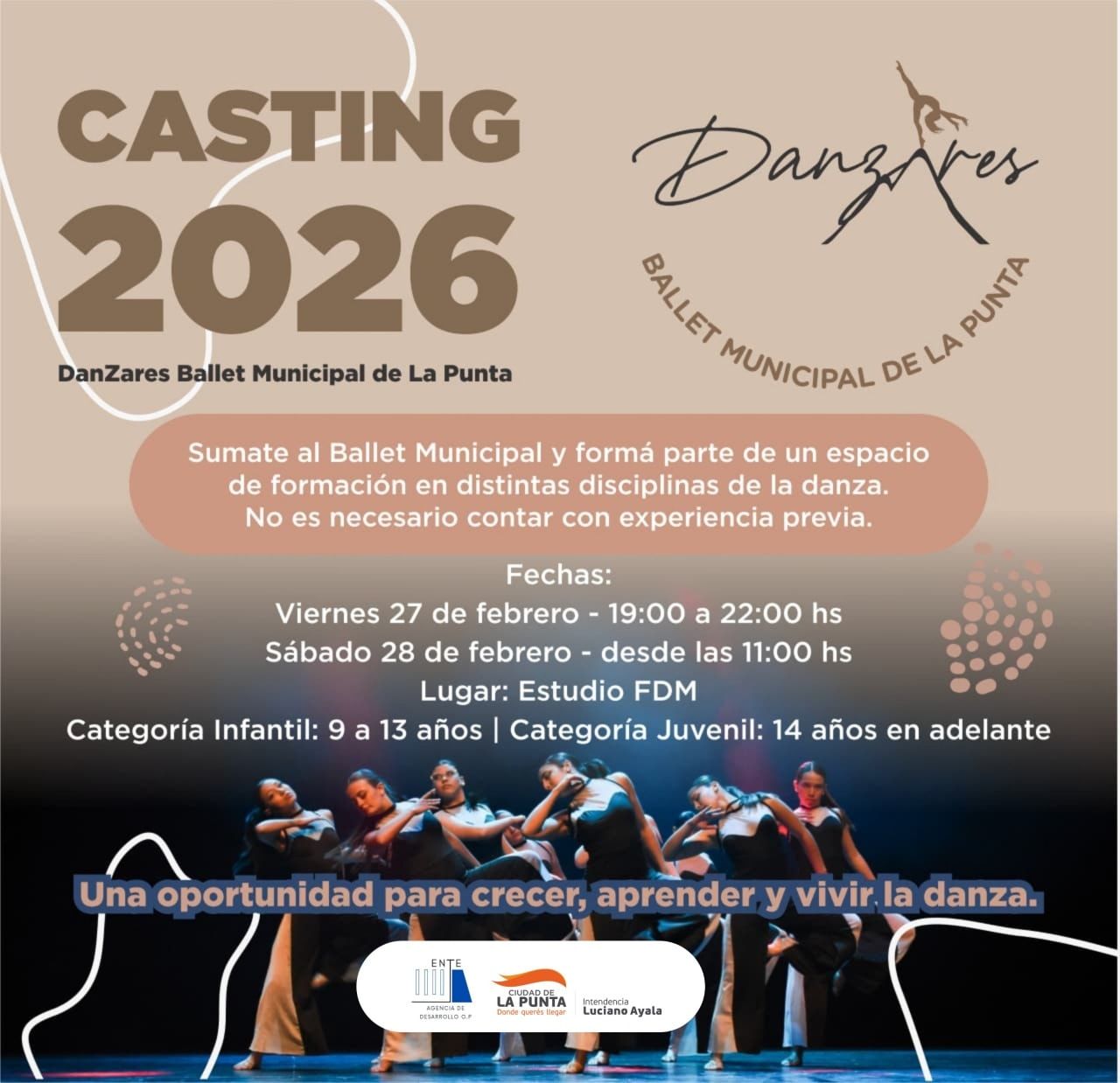 El Ente Agencia de Desarrollo lanzó la convocatoria para integrar el Ballet Municipal “Danzares”. El casting será el 27 y 28 de febrero y no se requiere experiencia previa.