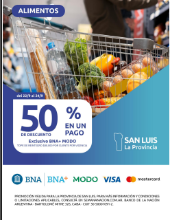 Desde este lunes 22 hasta el miércoles 24 de septiembre, el Banco Nación y el Gobierno provincial pondrán en marcha una promoción especial: 50% de descuento en alimentos en un pago.