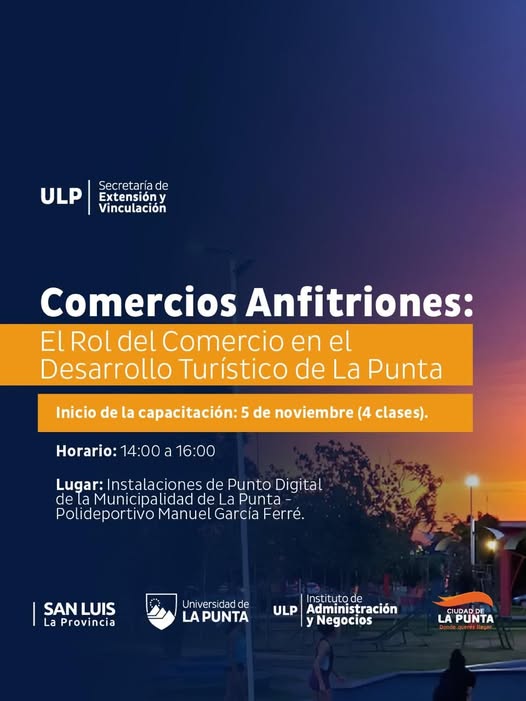 La Municipalidad de la Ciudad de La Punta, junto a la Universidad de La Punta (ULP), pondrán en marcha la capacitación “Comercios Anfitriones: el rol del comercio en el desarrollo turístico de La Punta”, una propuesta que busca consolidar el vínculo entre el sector comercial y el crecimiento turístico de la ciudad.
