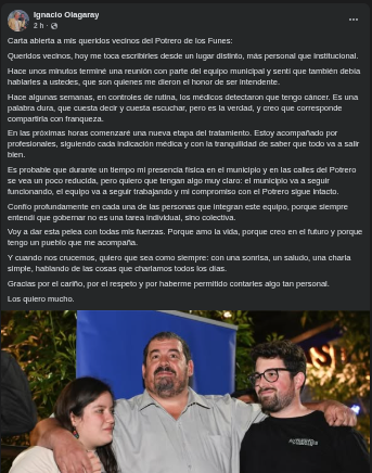 El intendente de Potrero de los Funes, Ignacio Olagaray, comunicó este lunes a los vecinos de la localidad que atraviesa una enfermedad oncológica que lo obligará a reducir su presencia física en la vía pública y en el edificio municipal, aunque aseguró que continuará al frente de sus responsabilidades institucionales.