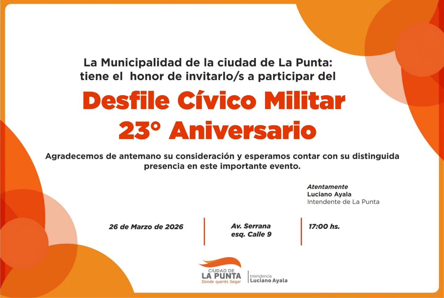 El desfile cívico militar aniversario La Punta ya comienza a tomar forma. La Municipalidad invitó formalmente a asociaciones, clubes e instituciones de la ciudad a sumarse al tradicional acto que se realizará el 26 de marzo a las 17:00, en la intersección de Avenida Serrana y Calle 9.