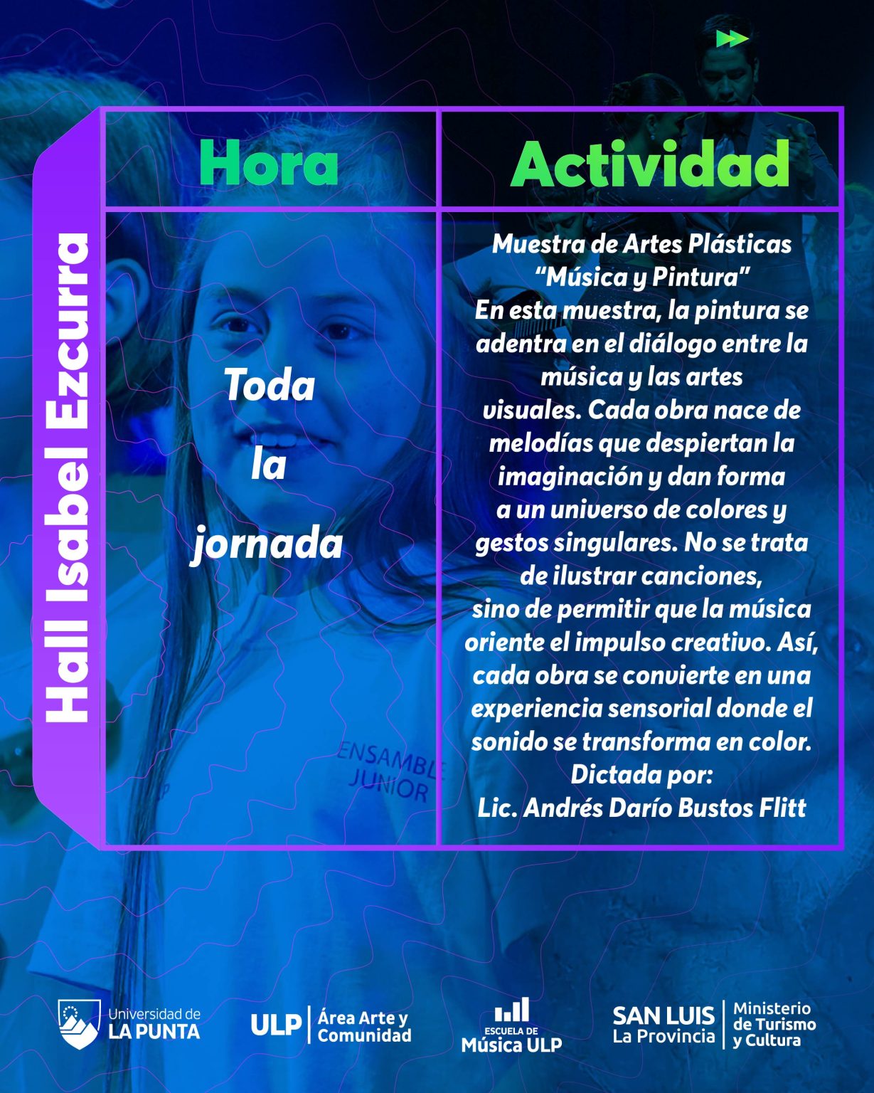 Durante toda la jornada, las salas “Hugo del Carril”, “Berta Vidal de Battini” y el hall “Isabel Ezcurra” se llenarán de música, teatro y color. Más de 800 participantes —entre estudiantes, docentes y equipos de trabajo— compartirán producciones gestadas en los talleres de la Escuela de Música, el Taller de Teatro y el espacio de Artes Visuales.