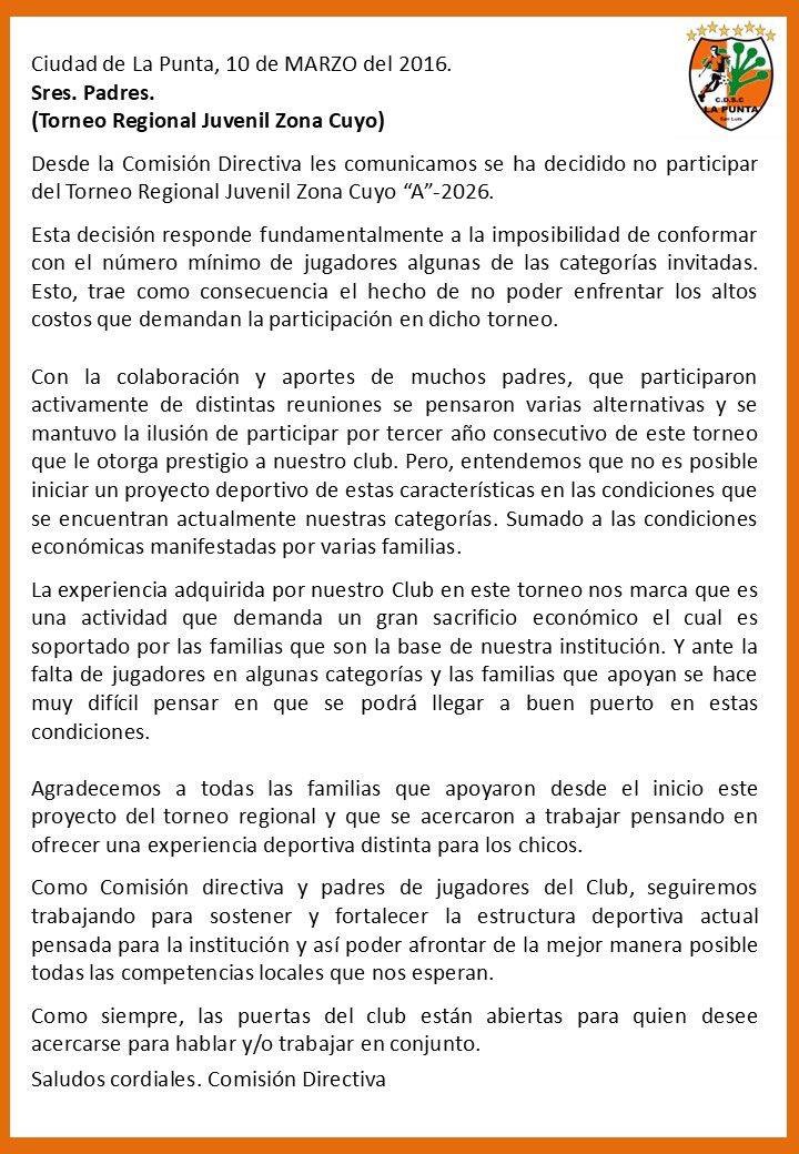 La Comisión Directiva comunicó a las familias la decisión de no disputar el Torneo Regional Juvenil Zona Cuyo “A” 2026. La medida se fundamenta en la imposibilidad de completar planteles y en el fuerte impacto económico que implica sostener la competencia.