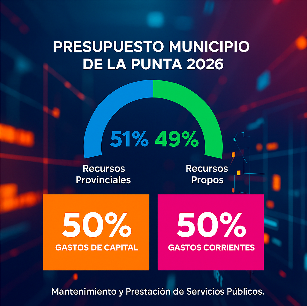 El presupuesto está compuesto por un 51% de recursos provinciales y un 49% de recursos propios. La distribución es clara: la mitad destinada a gastos de capital —adquisición de bienes, obras y mantenimiento de infraestructura— y la otra mitad a gastos corrientes, con foco en garantizar la prestación de servicios públicos de calidad.